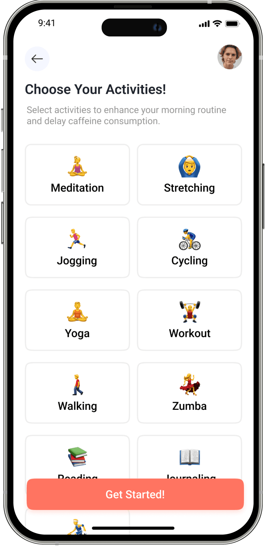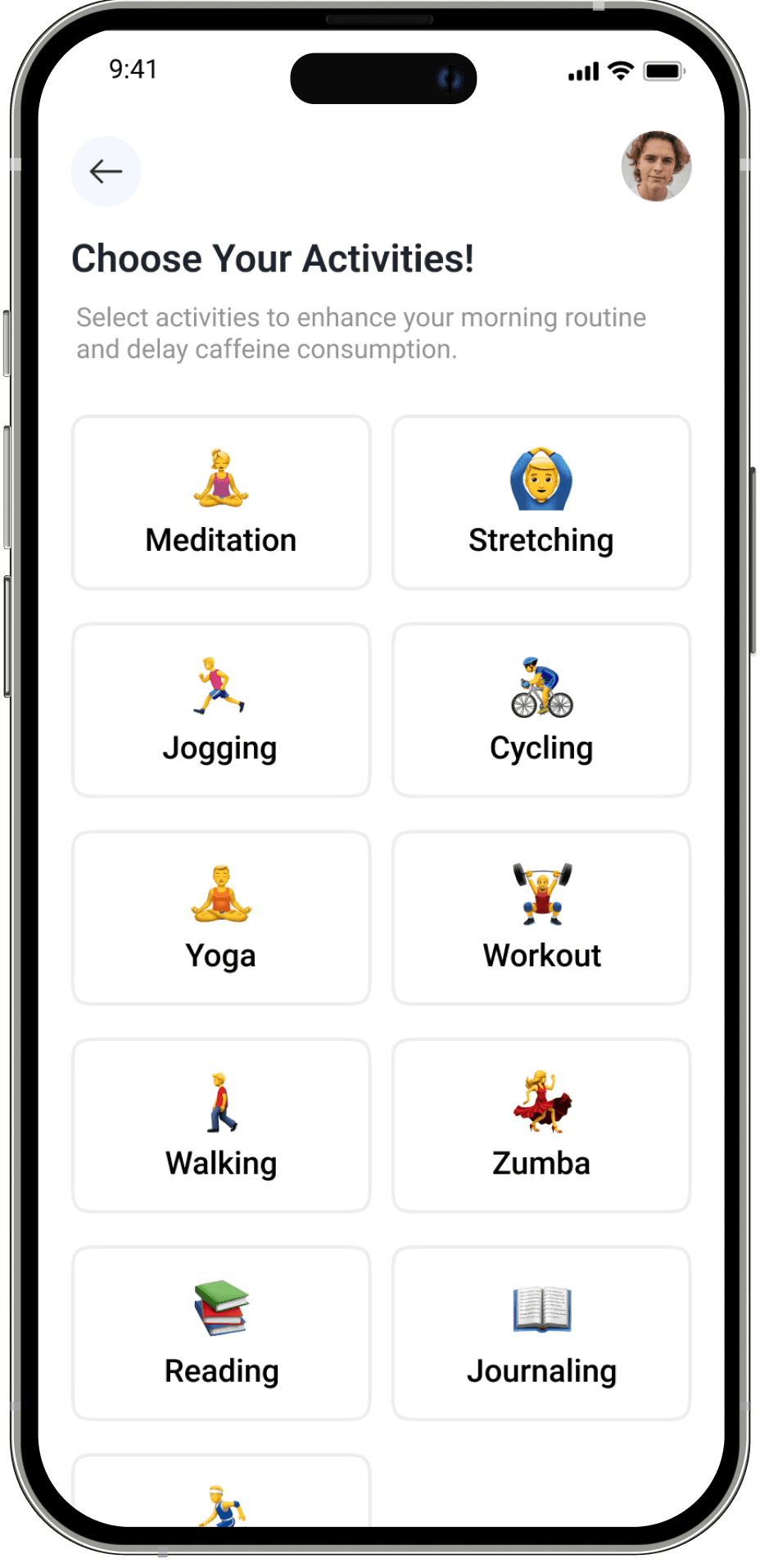 The activity selection menu presents users with a range of options to choose from, to tailor their morning routine according to their preferences and needs , that helps them delay caffeine